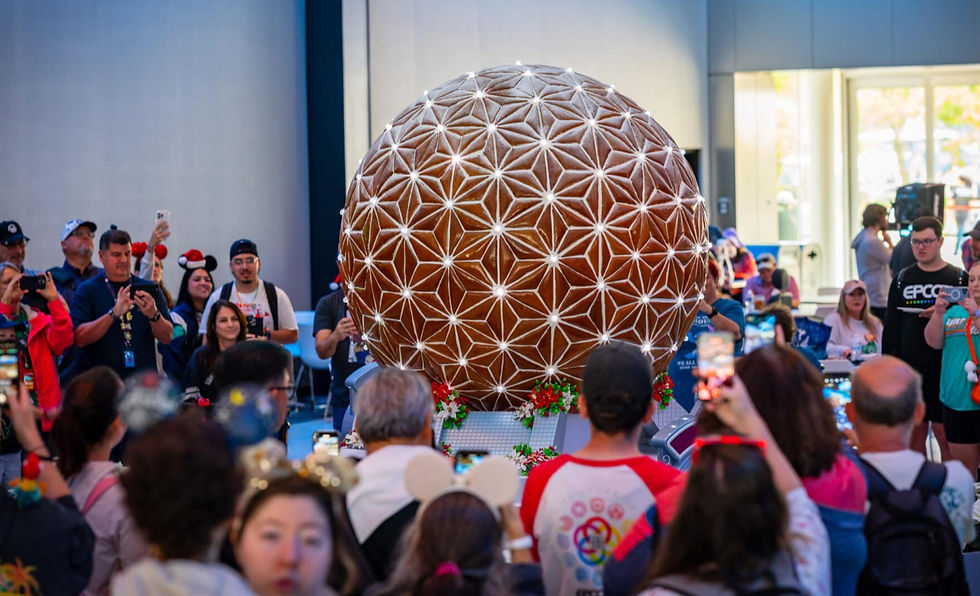 At EPCOT's Festival of the Holidays, special offerings include this 8-foot-tall gingerbread structure, modelled after the real Spaceship Earth and made with real gingerbread, icing, and chocolate. "Gumdrop" lights create a 3-minute light show that plays throughout the day. This project was created in 2024 and is freshly reassembled for guests to enjoy every winter holiday season.